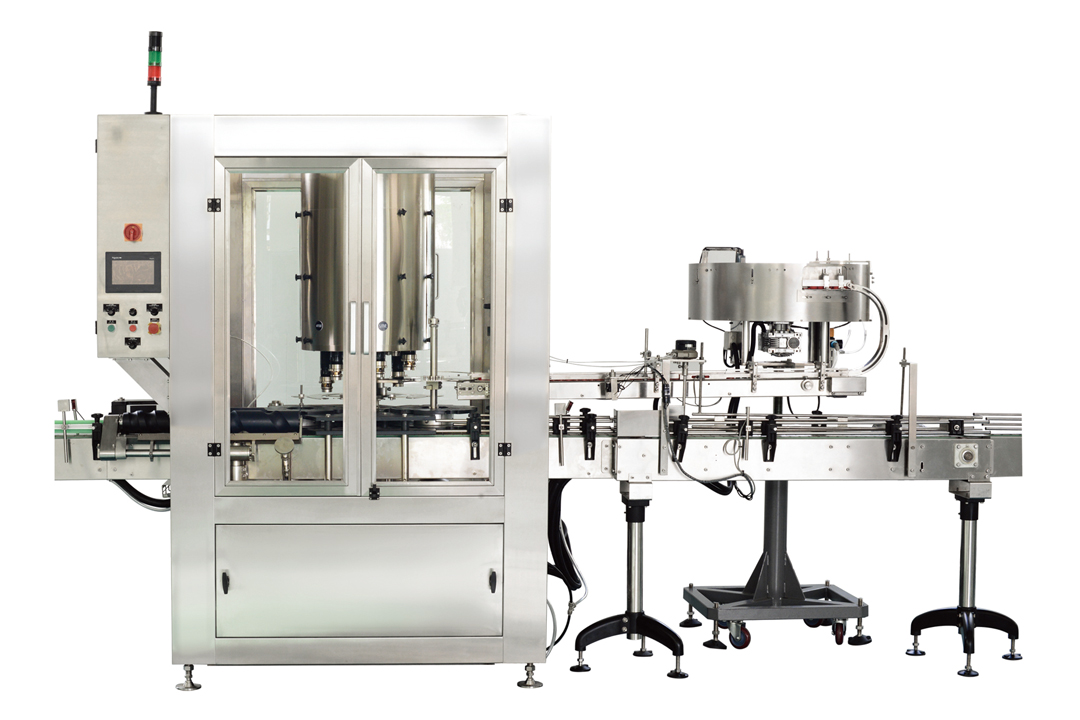 该机适用于各种规则玻璃或塑料瓶的各种外盖自动旋合,采用抓盖器抓取刮盖板输送来的各种盖子,在瓶子回转过程中完成外盖的旋合。回转式结构,采用专用抓盖器抓盖,稳定、可靠。在抓盖器内侧设计有耐磨橡胶,能有效杜绝在旋盖过程中产生的伤盖。螺杆分瓶并加装进瓶检测装置,实现无瓶不抓盖,堵瓶,倒瓶自动停机报警。所有传动处均装有离合机构,进出瓶星轮出现卡瓶或主轴扭矩过载时自动离合并停机报警。止旋刀、皮带式夹紧、瓶底止旋垫的设计,可适用于各种玻璃或塑料瓶在旋盖时的止旋。出瓶侧为双输送带结构,并安装有智能检测装置,合格瓶正常输送,不合格(无盖、歪盖、无铝膜盖)瓶,利用摆动气缸,自动分流至另一输送带。当旋盖机后道堵瓶时自动暂停,堵瓶情况回复后设备自动恢复运行。在输盖皮带上装有反盖、无铝膜盖自动剔除装置,确保所有的盖都是合格的。同时在输盖皮带上加光电检测,满盖后自动停止理盖,无盖则自动报警提示。该机为电动式升降调节,更换规格时只需在触摸屏中操作即可实现高度调整。快换式模块化进出瓶星轮设计,并刻有不同瓶型的直径代号,一目了然,更换瓶型规格更加方便快捷。反盖自动跌落,确保无反盖进入机器,下盖轨道采用整体式无节点轨道,有效解决卡盖问题。