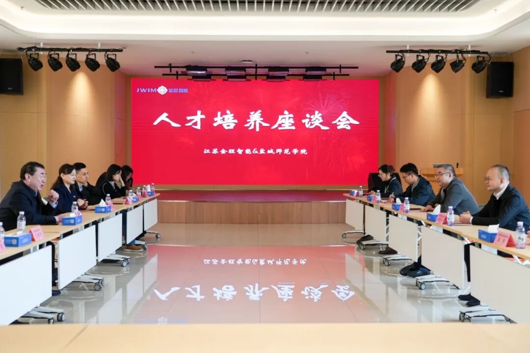移步至三楼报告厅,一场聚焦人才培养与地方发展的思想碰撞正式开启。区委统战部常务副部长、区工商联党组书记汤鹏飞主持会议并介绍参会人员,他强调:“此次盐城师范学院与金旺智能的合作,是校地企协同发展的生动实践,期待双方能在人才输送、产业升级等方面结出硕果。”