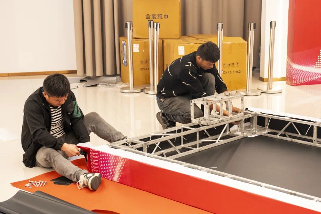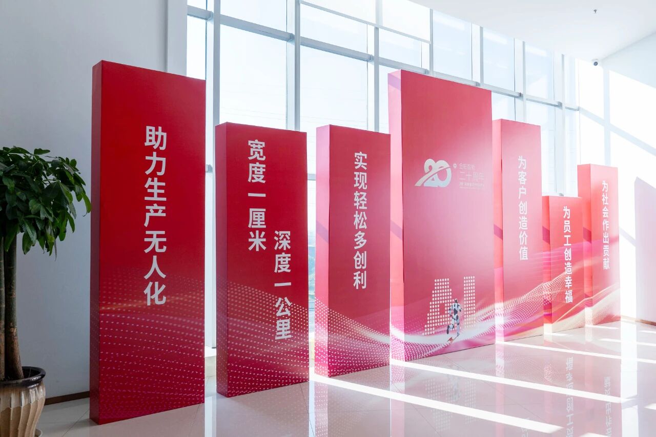 带着这份感动与力量,公司正紧锣密鼓地筹备二十周年庆典。目前,庆典主会场已初具规模,处处洋溢着喜庆氛围。主会场内,工作人员正在精心调试专业的灯光音响系统,"感计岁月如智汇璀璨新篇"的主题背景墙巍然矗立,与员工奖牌交相辉映,共同诉说着企业的发展故事。