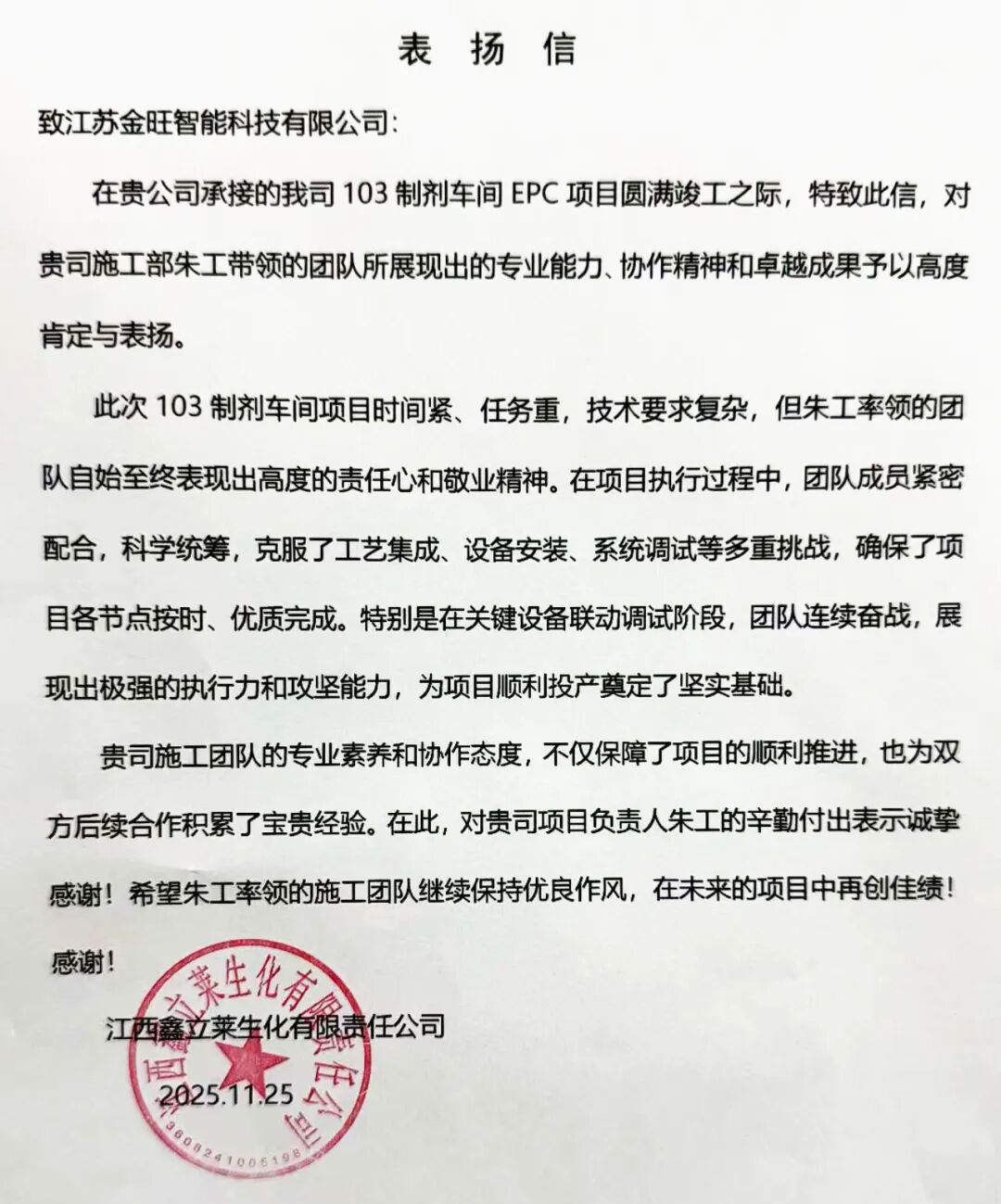 近日,由我司承接的江西85项目(103制剂车间EPC项目)顺利竣工,并赢得客户的高度认可与赞誉。江西鑫立莱生化有限责任公司特地发来 表扬信 ,对朱工带领的施工团队在项目中展现出的专业能力、敬业精神与卓越成果予以充分肯定。
