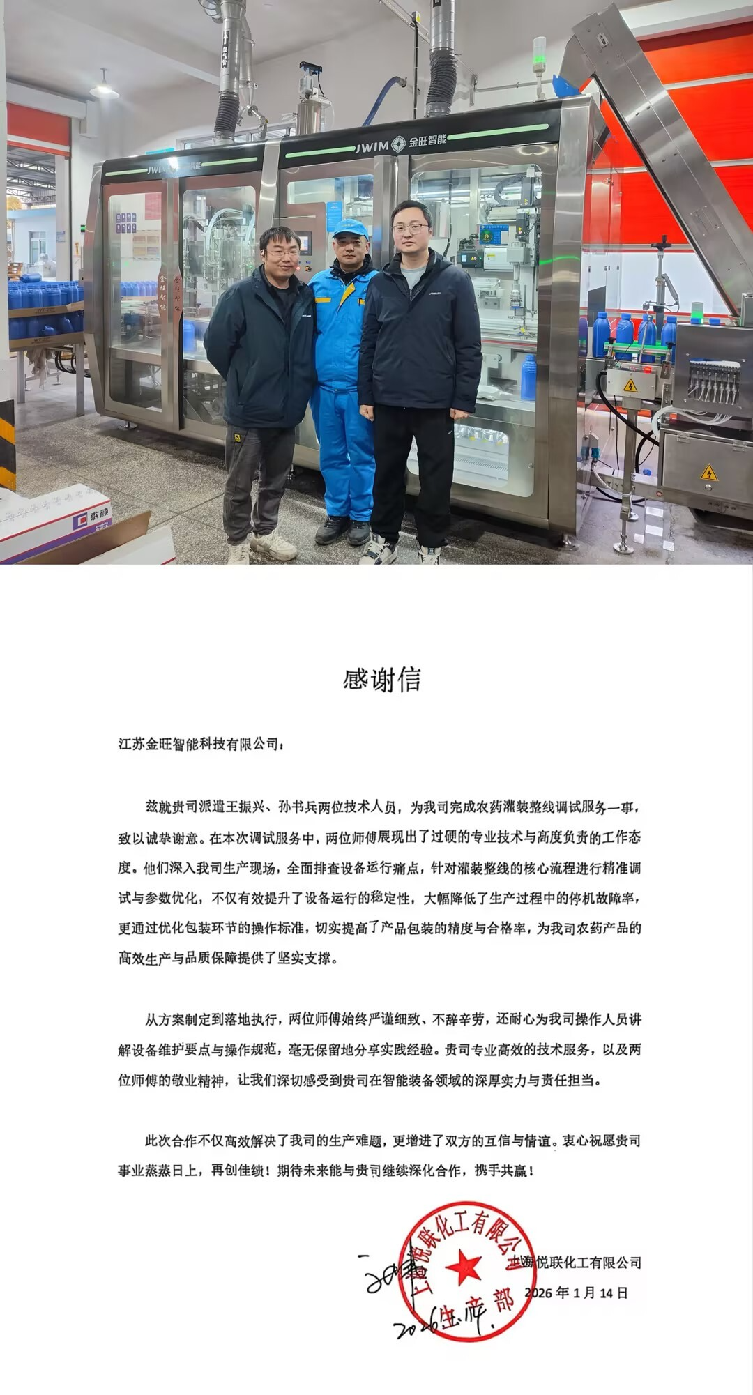 近日,上海悦联化工有限公司向我司发来一封热情洋溢的感谢信,对金旺技术团队的王振兴、孙书兵两位同事在项目中的卓越表现,表示高度认可与诚挚感谢。