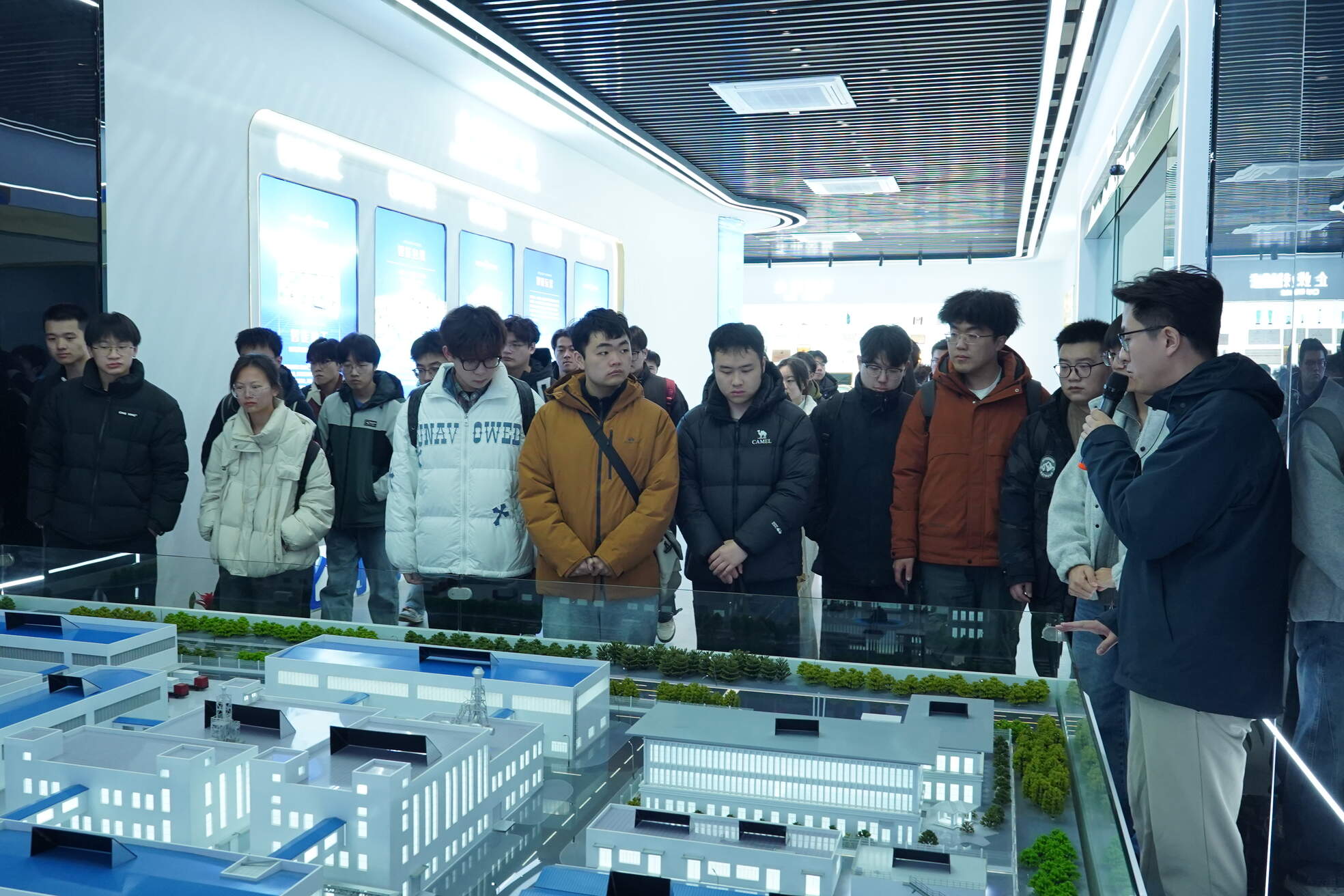 在金旺智能工作人员的带领下,常大学子们先后参观了企业文化展厅、智能产线演示区及具身智能机器人研发实验室。从企业发展历程、核心技术专利,到AI语音切换磁悬浮产线的实景运行,再到“金智劳动者”人形机器人的现场演示,同学们边走边看、边问边记,对农化制剂智能制造领域的创新成果有了直观深入的了解。