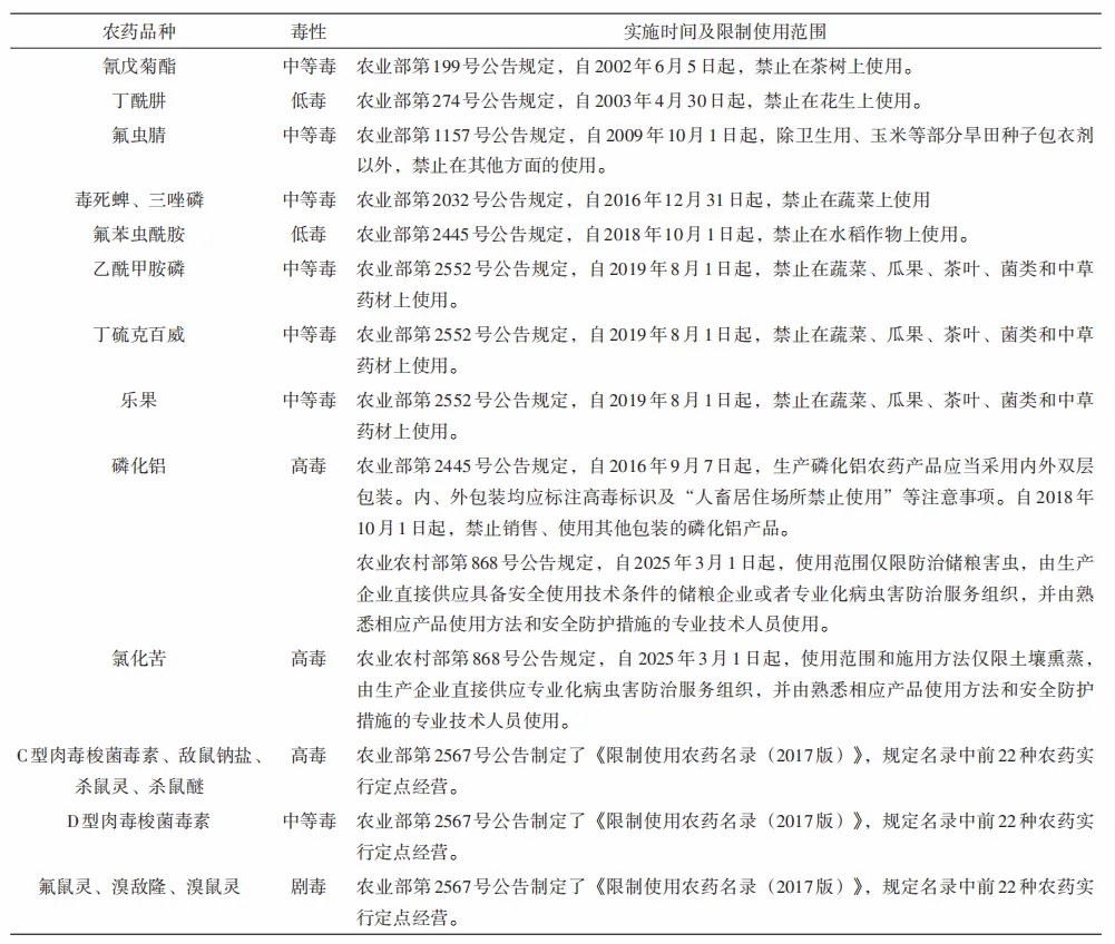 法律规制上,1997年,国务院颁布《农药管理条例》,明确规定剧毒、高毒农药不得用于防治卫生害虫,不得用于蔬菜、瓜果、茶叶和中草药材,使禁限用农药管理工作步入了规范化、法制化的轨道。该条例经过2017年、2022年2次修订,对禁限用农药的生产、使用等做了更为全面的规定和指导。此外,2021年修订的《中华人民共和国食品安全法》和2022年修订的《中华人民共和国农产品质量安全法》有关条款,对禁限用农药等农用投入品的使用做出严格的规定,包括严格执行农业投入品使用安全间隔期或者休药期的规定,禁止将剧毒、高毒农药用于蔬菜、瓜果、茶叶和中草药材等国家规定的农作物,禁止在农产品生产经营过程中使用国家禁止使用的农业投入品以及其他有毒有害物质等相关内容。